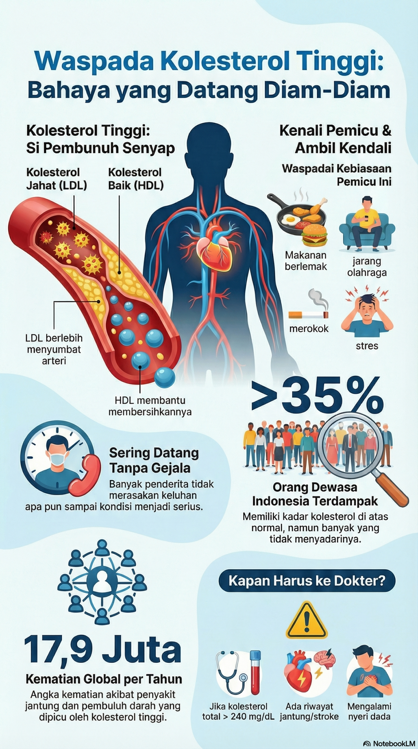 Kolesterol tinggi sering tidak menimbulkan gejala, tetapi dampaknya bisa sangat serius. Dengan memahami kebiasaan yang memicu kolesterol tinggi, mengenali risikonya, serta tahu kapan harus ke dokter, kita bisa mencegah komplikasi sejak dini. Gaya hidup sehat, pemeriksaan rutin, dan dukungan herbal dapat menjadi langkah pencegahan yang bijak.